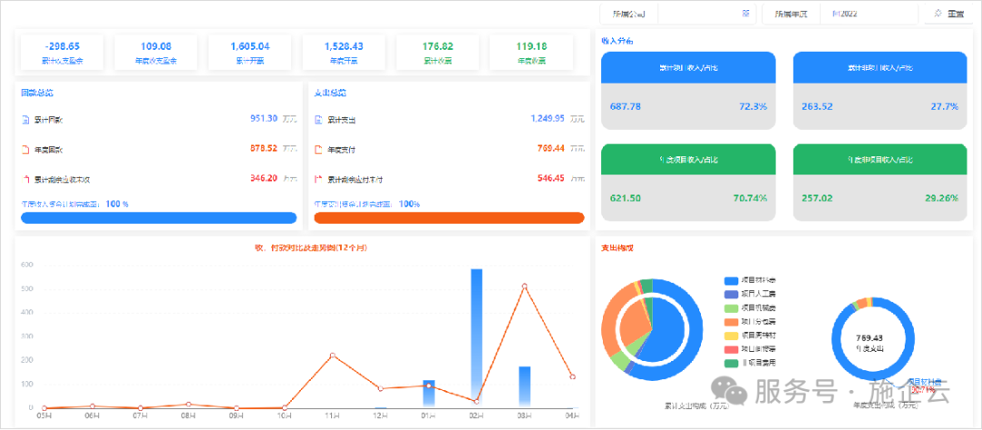 建立实时监控与分析机制,项目成本动态展示、施工进度全程可视、成本超支、进度滞后智能预警。项目收支、合同履约、往来账款等一览无余为管理层提供动态风险预警及决策依据,有效缩短决策响应周期。