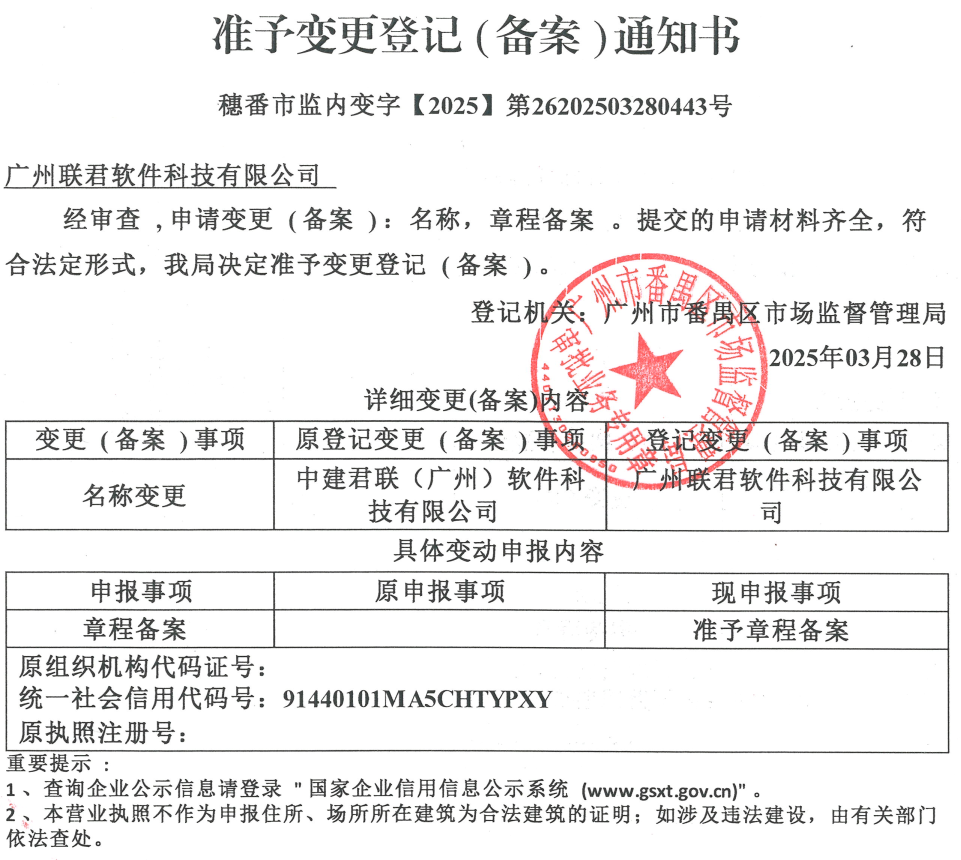 感谢贵司长期以来对中建君联(广州)软件科技有限公司的信任与支持!因公司战略发展需要,经工商部门核准,我司自即日起正式启用新公司名称,原公司名称同步停止使用。现将相关事项告知如下: 原公司名称:中建君联(广州)软件科技有限公司 新公司名称:广州联君软件科技有限公司