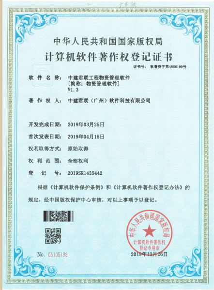 2019年12月26日,中建君联(广州)软件科技有限公司,继2019年4月19日”中建君联工程物资云平台”首次获得中华人民共和国国家版权局计算机软件著作权证书,现在“中建君联工程物资管理软件”再次获得中华人民共和国国家版权局计算机软件著作权证书,